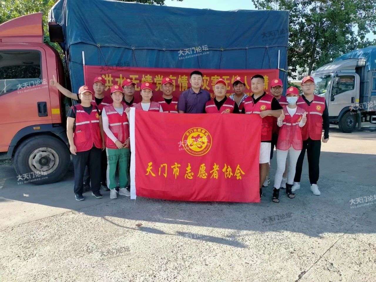 7月25日下午,天门第一批驰援河南的志愿者们将筹集到的生活物资装车,货车上挂着“众志成城 共战洪魔”“风雨同舟 共筑家园”字样横幅,连夜前往河南省新乡市,务必将救援物资第一时间送到灾区群众手中。