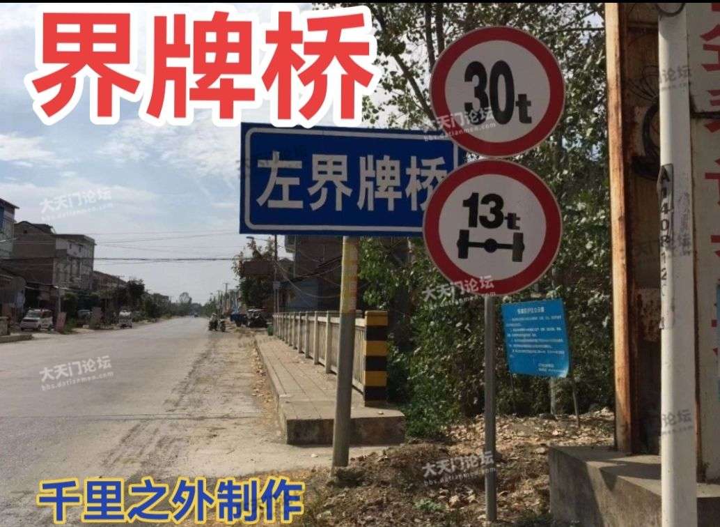 金秋十月,秋高气爽。今天下午体感温度适宜。我和两个朋友已提前约好了,我们一行三人从繁闹的干驿镇区驱车,沿武(汉)大(理)线348国道(原荷沙公路),一路东行4公里,来到一T形路口处靠边驻车。落下右边车窗,跃入眼帘的是承载着历史变迁与沧桑,具有古朴之美的牛蹄支河;公路左侧有一缓坡乡道,提前做过功课,知道左拐下坡300米即到城隍古寺和“晴滩八景”之首的直台古槐;而目视车的前方界牌村就分布在公路两侧,南侧房屋应该是倚原牛蹄支河的堤坝而建。稍作停顿后,我们商议还是先前往界牌桥。前行不足500米即可到界牌桥。公路两侧住户、门市楼房林立,鳞次栉比,是小有规模的集市。虽算不上繁华,但各类商铺门市比比皆是,充满着勃勃生机。靠公路边停车后,我们步行来到界牌桥上。桥面比公路要略宽些约有20米,桥长约30米。是天(门)汉(川)的交界处,也是原荆州地区与孝感地区的交界处,也历来是州、府间的交界处。