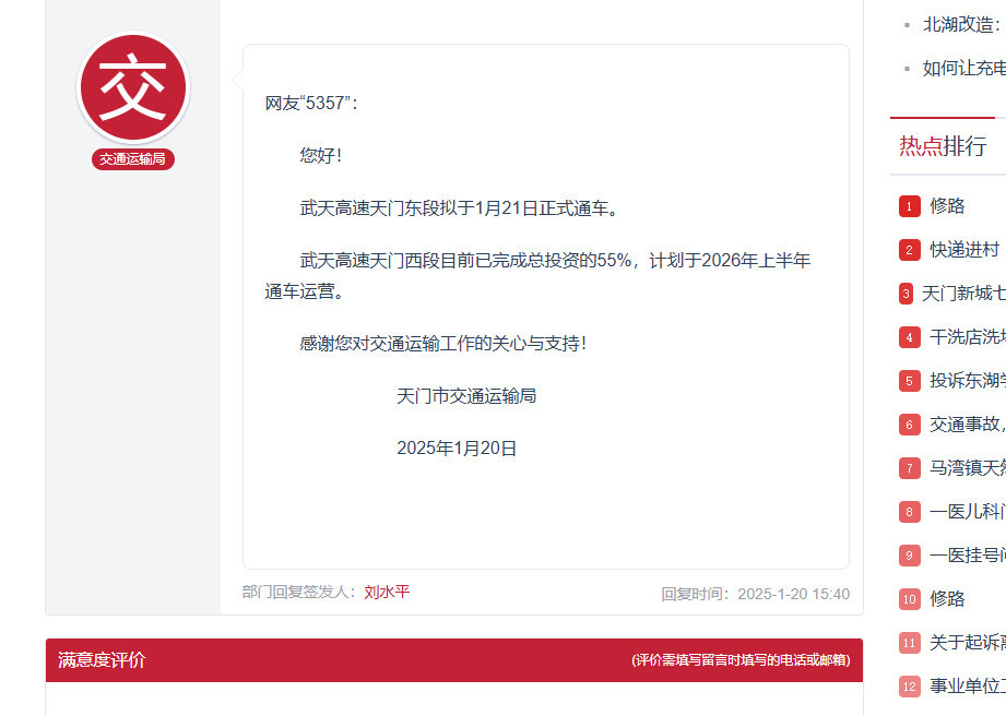 根据市委书记留言板的回复,武渝高速天门东段预计元月21日通车。
