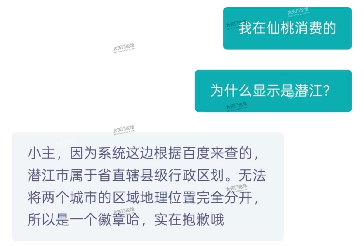 对此,茶颜悦色官方客服回复称,无法将潜江和仙桃的地理位置完全分开,在仙桃消费只能显示潜江。