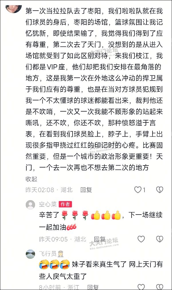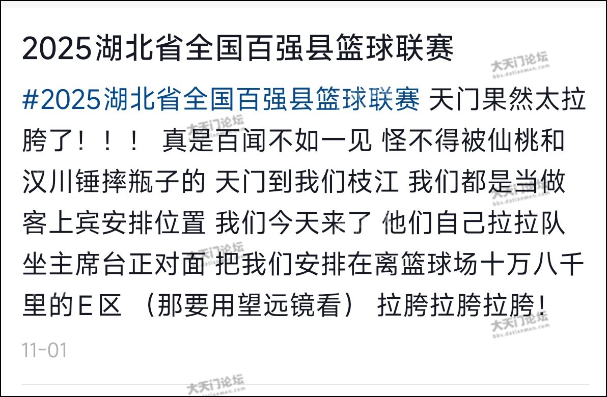 欲加之罪 何患无辞了,输了球总要发泄一下情绪的了,安排V l P座了,他又要说你不跟他枝江队喊加油了,喊了加油他要说你裁判有问题了,又是天门场地地板滑,又是扔瓶子,居然还有人说礼品问题的,说天门送礼不该单数,应该双数,我是服了,反正光话,各种节奏,竞技体育,比赛永远第一,别扯什么友谊第一,虚伪,那个输了不是枪会死,你枝江输个几分,你犟一下能理解,主客场都输天门二十几分了,一共输了8场,就赢了2场,坐VIP枝江就赢吧,挨打就立正,输赢了都有话说的,兄弟县市竟争永远大于合作,连周边县市都如此,何况离的远的枝江,是其他城市没扔瓶子还是汉川的没打架,光盯着天门挑理了,无所谓,礼行讲不完的,不跟你讲礼行又怎么了?虚伪违心的喊枝江加油,安排VIP,难道就能满足你了吗?我看未必,总是有话说的