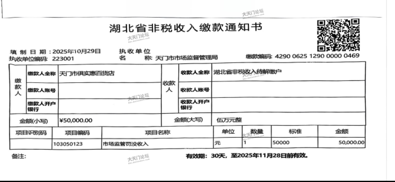 天门市俱实惠百货店:我局立案调查的你店因帮助其他经营者对产品功能作虚假宣传一案,已于2025年10月11日作出行政处罚决定并下达《天门市市场监督管理局行政处罚决定书》(天市监处罚〔2025〕798号)。因采取直接送达和邮寄送达的方式均无法确定是否送达当事人,根据和《市场监督管理行政处罚程序规定》第八十二条第(五)项的有关规定,现公告送达,自本公告发布之日起经过三十日即视为送达。