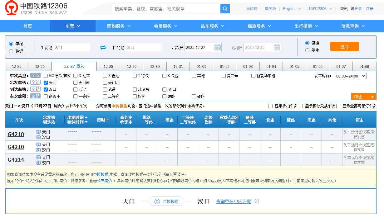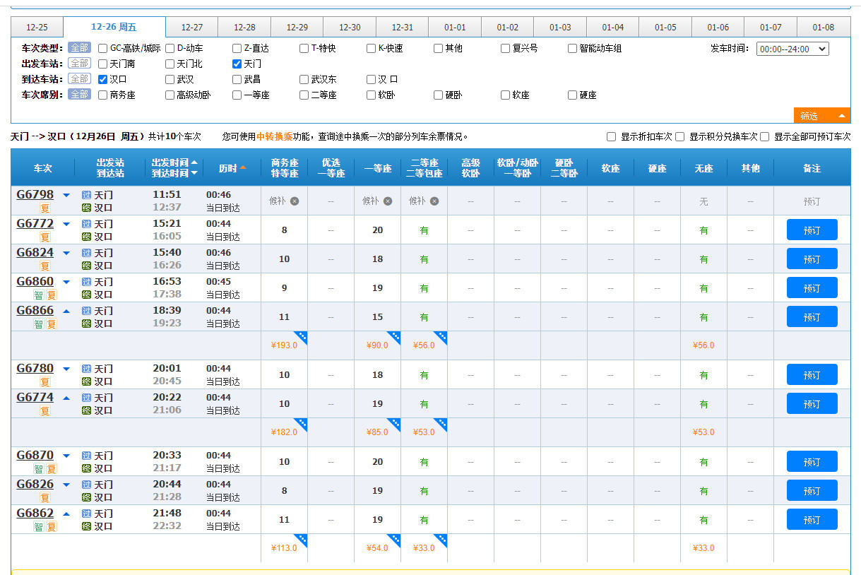 武汉至宜昌高铁车次已上线12月26日开通,汉口到天门站预计单程票价52-55元