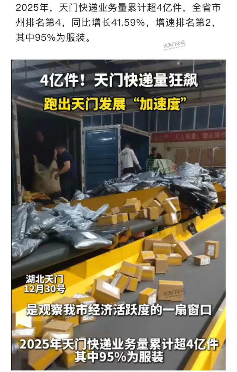 天门服装快递量狂飙4亿件
