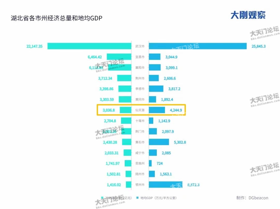 3000亿元的经济体量,在湖北高于十堰、荆门、黄石、咸宁、恩施等一众城市。虽然只是县级市,但要论地均GDP,仙天潜的富庶程度,甚至超过孝感、襄阳、宜昌、荆州等地。